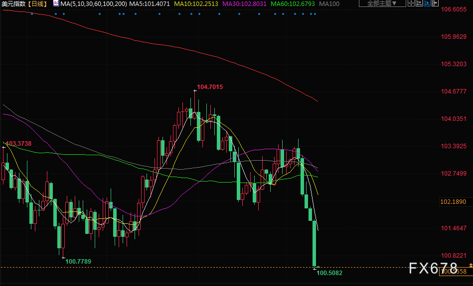 美元指数一度触及100.54的2022年4月以来最低,盘尾下跌1%,报100.55,势将创下2月初以来最大单日百分比跌幅。美国通胀报告公布后,美元兑瑞郎触及2015年初以来最低。美元尾盘下跌1.3%,报0.8675瑞郎,稍早一度低见0.8660瑞郎,为瑞士央行2015年1月取消瑞郎盯住汇率制度以来的最低水平。