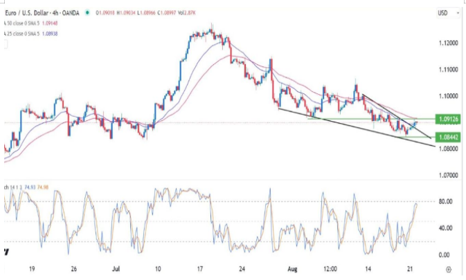 欧元兑美元小幅波动,因市场参与者在上周跌至多周低点1.0844后逢低买入。随着美国国债收益率持续走高,其反弹至1.0900高位。由于大多数投资者开始关注即将举行的杰克逊霍尔研讨会,欧元兑美元反弹。这次会议将为央行主要高管提供有关未来几个月预期的更多信息。从历史上看,这次会议往往会影响外汇和股票等所有资产。