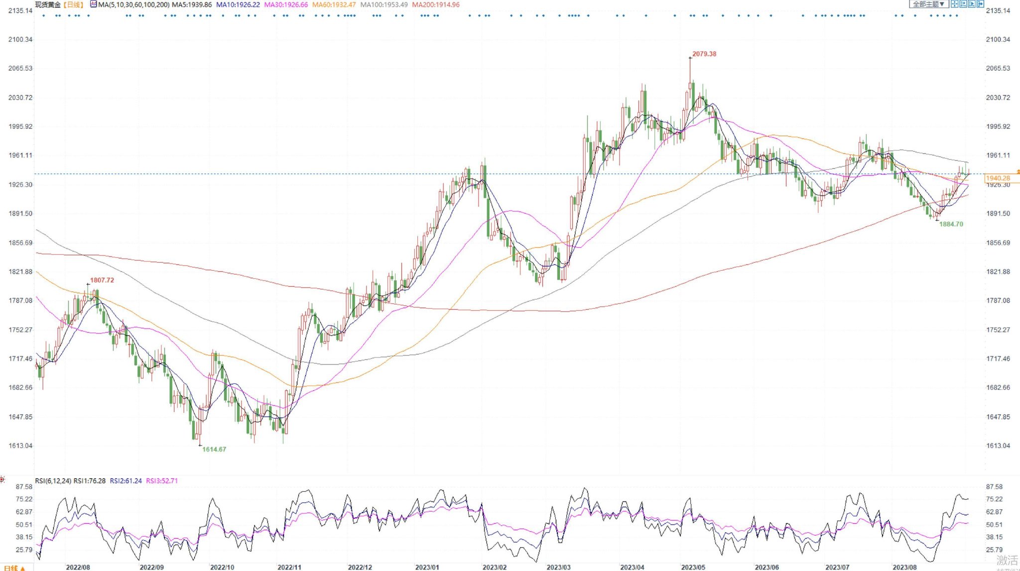 现货金日内窄幅震荡,目前交投在1940美元附近,上周五曾攀升至一个月高位1,952.79美元。