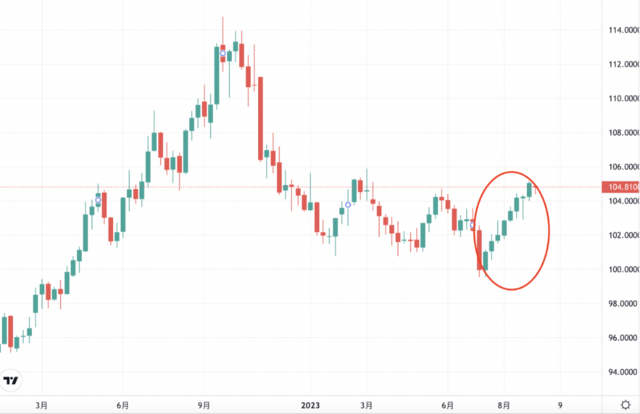 美元在今年曾一度回落,但随后又意外强势上行,从跌穿100到一路飙升突破105关口。截至9月8日当周,美元指数罕见地走出八周连阳,这是2014年以来最长连涨纪录。自7月低点以来,该指数已上涨5%。