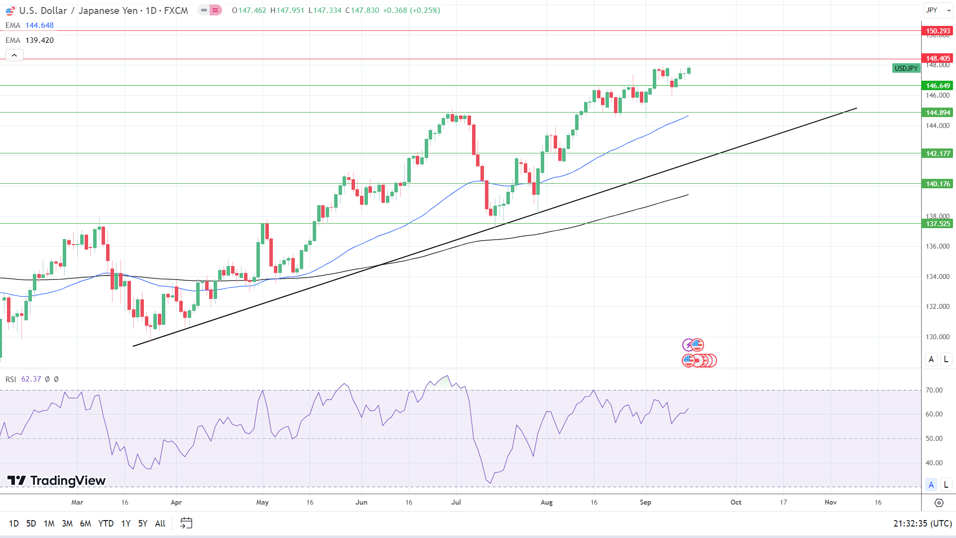 市场对日本和美国经济的情绪,以及货币政策预期,将是今天的主要驱动因素。14日RSI的62.37表明,美元/日元在进入超买区域之前将升至148.405阻力位。