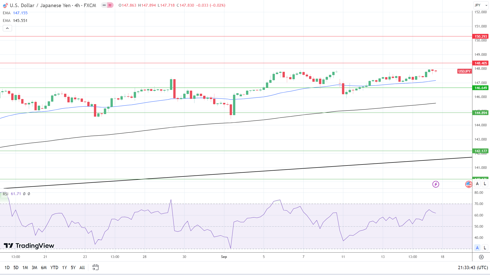 然而,突破148.405阻力位将看到150.293阻力位。14-4小时RSI读数61.71表明,美元/日元在进入超买区域之前回到148。