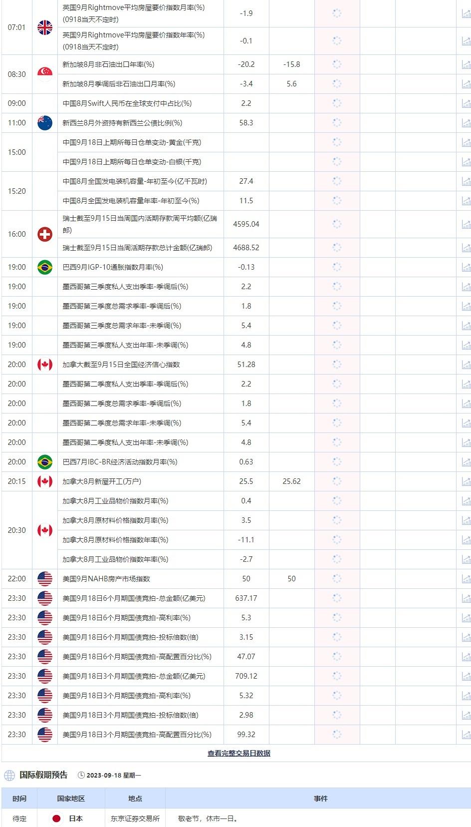 9月18日,投资者需要关注的重点数据:加拿大截至9月15日全国经济信心指数,加拿大8月新屋开工数。需要关注日本东京证券交易所因敬老节,休市一日。