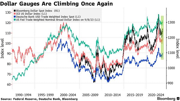 到目前为止,美元指数仍低于去年的峰值。这使得其影响比2022年要小得多,当时美元大幅升值推高以美元计价的石油等大宗商品的成本,加剧全球的通胀压力。