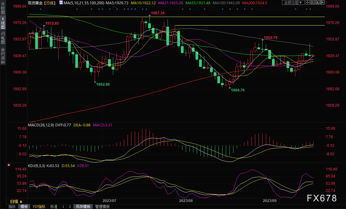 现货黄金高开低走,盘中最高曾触及1947.27美元/盎司,最低下探1927.84美元/盎司,收报1930.17美元/盎司,跌幅0.06%(或1.04美元/盎司)。