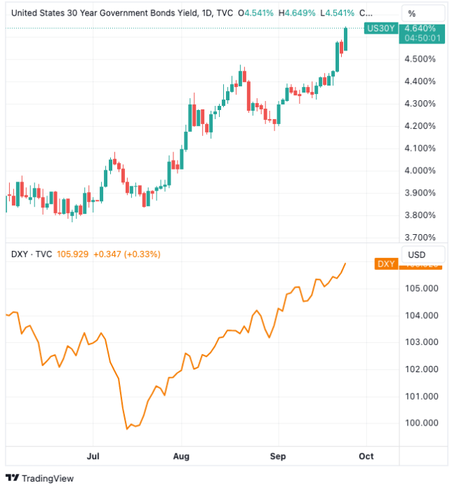 与此同时,随着美联储更多官员支持利率“长期更高”的政策,30年期国债收益率已飙升至12.5年高点。