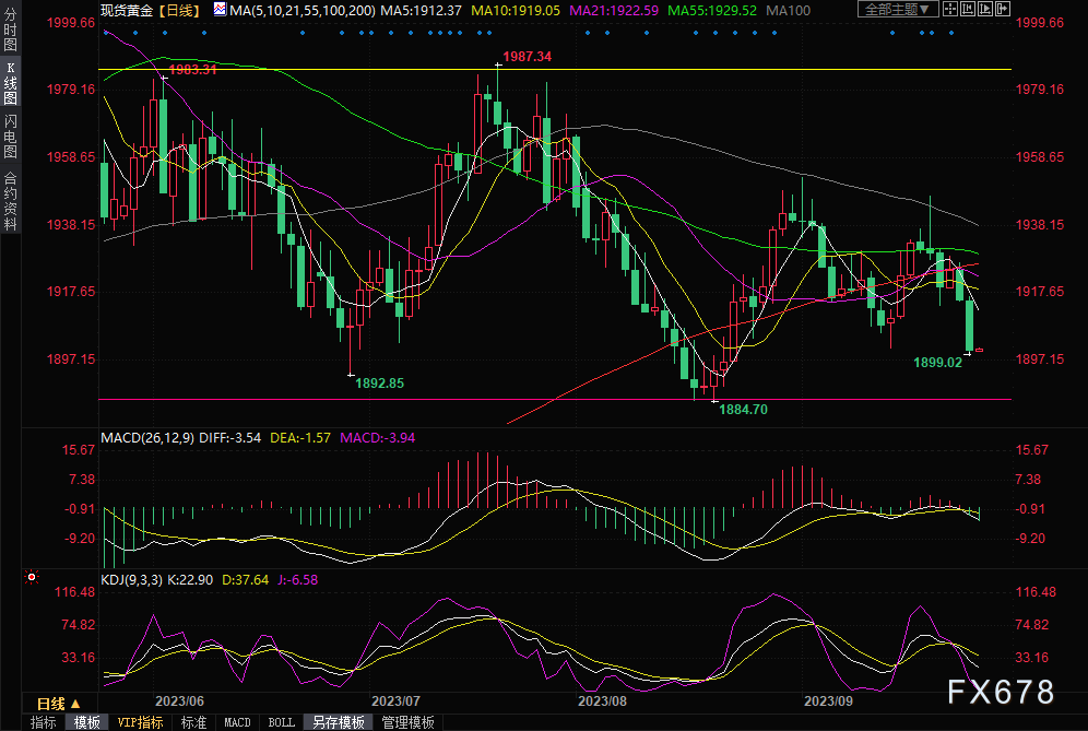 (现货黄金走势图)现货黄金价格收跌0.8%(或0.70%),收报1900.44美元/盎司。