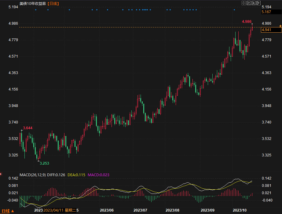 周四(10月19日)美市中,美国国债收益率再次飙升,在美联储主席鲍威尔发表主题演讲前几个小时,由于投资者在艰难的融资环境中要求更高的回报,基准10年期国债收益率升至近16年新高。