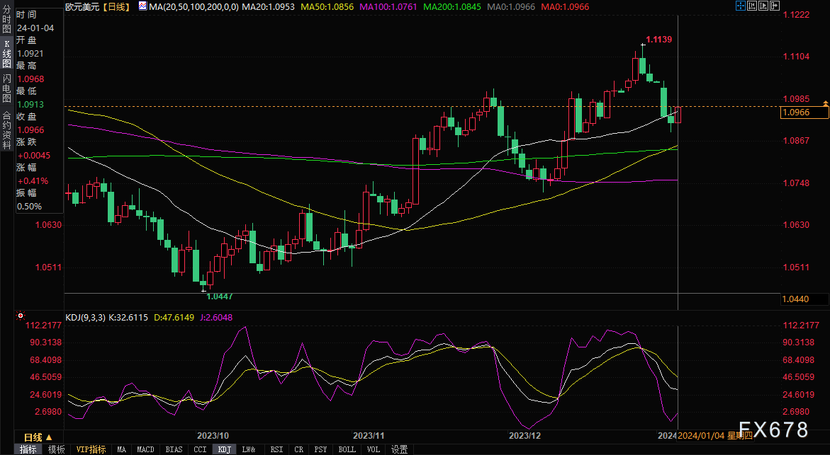 ——周四(1月4日),欧盘时段,欧元/美元交投于1.0969,涨幅0.44%。欧元主力交投于1.1000,涨幅0.46%。