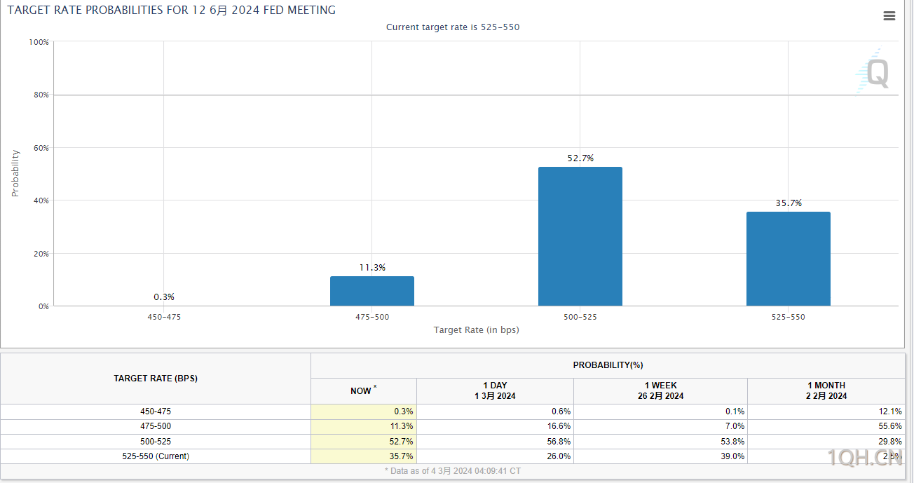 CME“美联储观察”:美联储3月维持利率在5.25%-5.50%区间不变的概率为97.0%,降息25个基点的概率为3.0%。到5月维持利率不变的概率为78.5%,累计降息25个基点的概率为21.0%,累计降息50个基点的概率为0.6%。到6月维持利率不变的概率为35.7%,累计降息25个基点的概率为52.7%,累计降息50个基点的概率为11.3%,累计降息75个基点的概率为0.3%