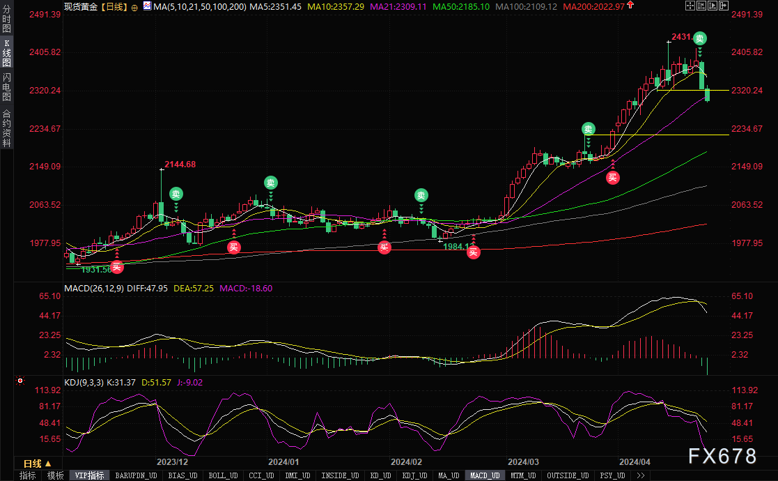 ——周二(4月23日)亚洲时段,现货黄金延续跌势,一度失守2300关口至2295.49美元/盎司。因对中东冲突的担忧有所缓解,从而提振了投资者的风险偏好,降低了黄金的避险需求,而且市场目光转向美联储可能推迟降息的预期,更多多头在金价回调之际获利了结。
