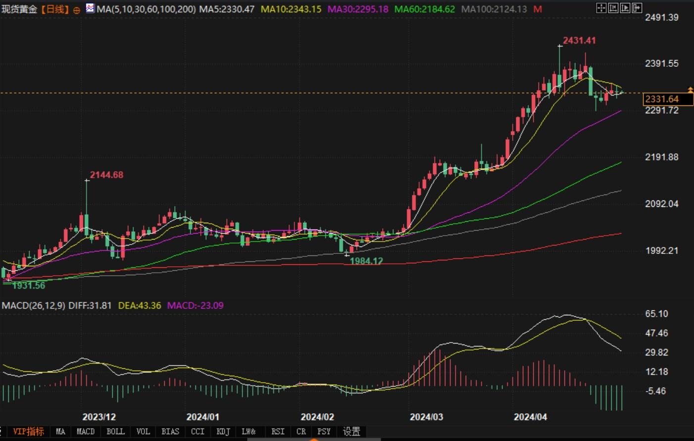 现货黄金日线图北京时间4月30日10:14,现货黄金报2329.73美元/盎司