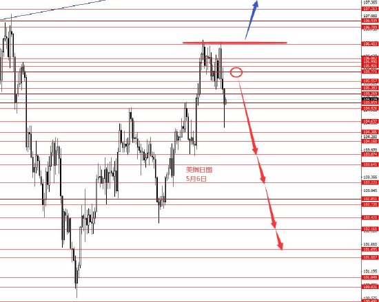 5月6日,上周美指二次探顶后快速回落,周五继续向下破位,周图收阴柱。从图形来看,美指目前顶部形态已出现,后市建议逢高做空,抓106.40至101.70区域这波下跌行情。日内短线关注周五低点,在没跌破前,日内区间震荡向上反弹的概率较大些。本周操作策略105.70附近做空,止损106.60,目标看向103.80和103.20,再看向
