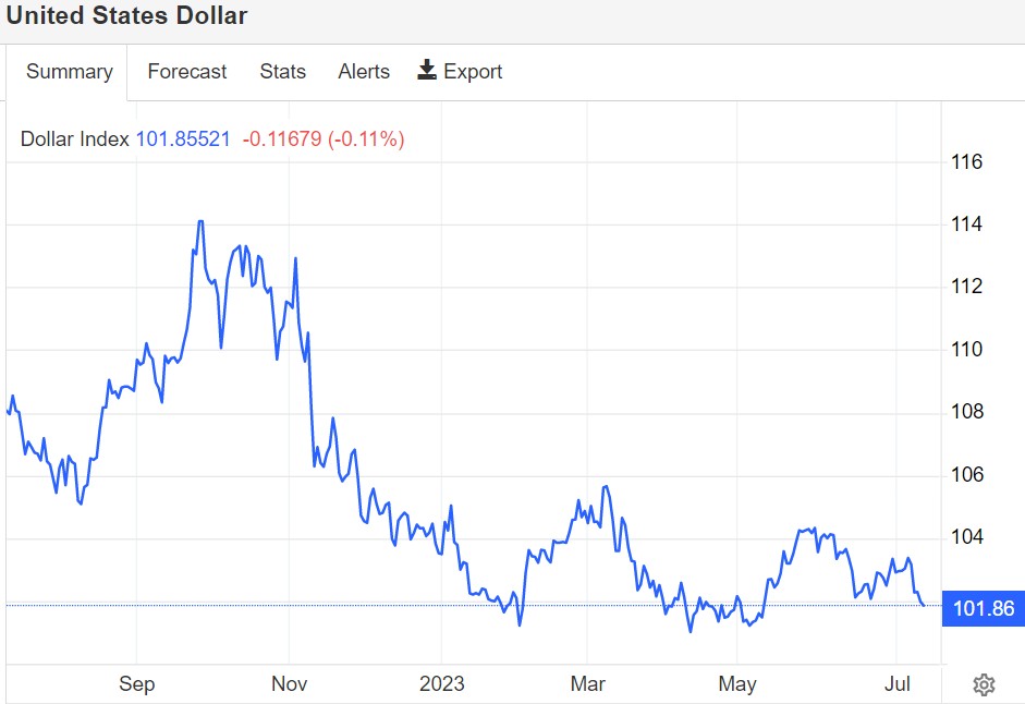 美元指数在周一跌至三周以来的最低点,周二亚盘交易时段继续走弱。此前美联储官员的讲话强化了交易员们对于美联储紧缩周期接近尾声的押注。不过,市场普遍预期美联储本月将再加息25个基点,尽管上周五公布的数据显示,美国就业增幅为两年半以来最小。在美联储6月份暂停加息之后,市场预计7月份将加息25个基点,但对之后加息的必要性存在疑虑。