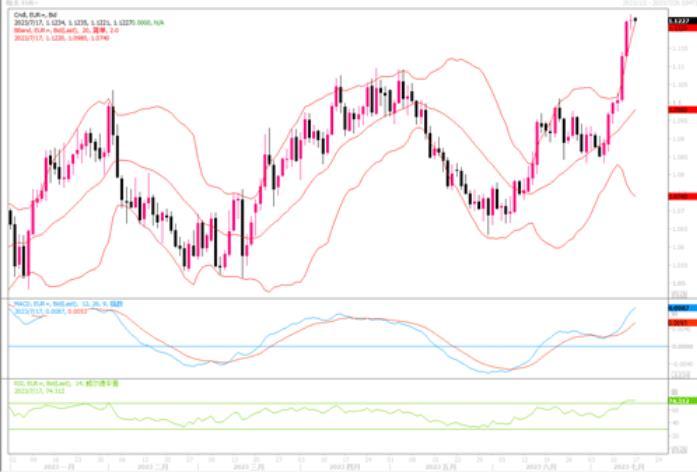 上周五(7月14日)欧元兑美元亚洲时段触及16个月高位1.1245美元,随后至纽约收盘阶段略回软,持平于1.1229美元。美元在过去几天大幅下跌后周五略反弹,因投资者在周末前进行一些整固性的反弹交易。最近美元的全面走软,主要是因美国反应通胀的数据接连出现明显下降,导致市场对美联储已接近加息周期尾声的预期大幅升温。利差优势行将不复存在的刺激下,欧元等一干非美货币是借机大幅蹿升。由著名经济学家在给客户的报告中写道,由于欧洲居民心态愈加乐观、服务业活动以及旅游业强劲。他预估欧元区第二季度GDP将小幅增长0.1%。在经济衰退的忧虑逐渐降低,且与美元利差渐渐有望缩小的大环境下,欧元或会继续得到一定的支撑。但从技术图形上观察,日线级别图上似乎有顶背离迹象,须防范近期由于欧元累计升幅过大出现获利回吐调整行情。上方重要的阻力水平在1.1280附近,而下方的支撑依次落在1.1150、1.1036。