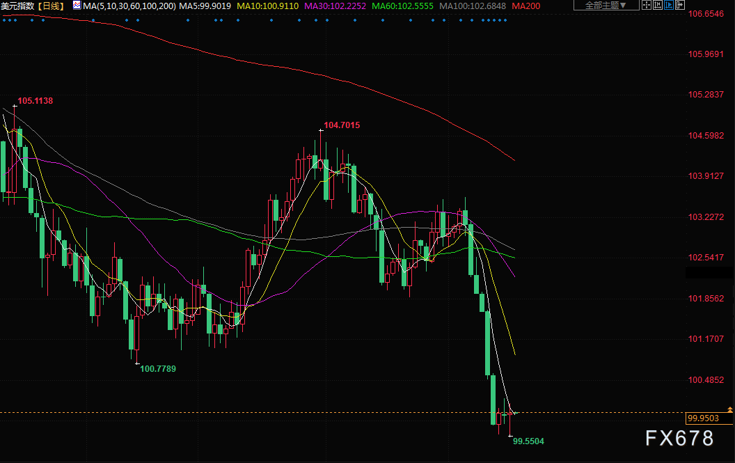 美元指数尾盘上涨0.04%,报99.924,稍早跌至99.549,为2022年4月以来最低。