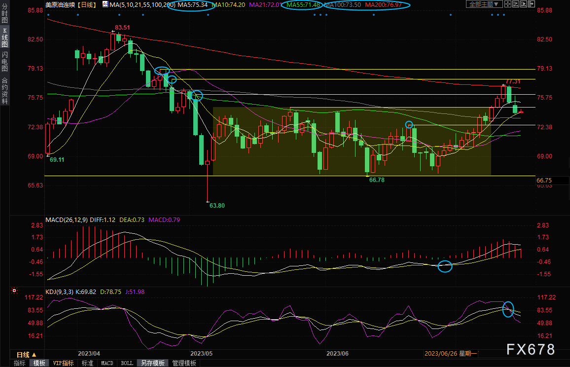日线级别:震荡;油价在200日均线附近受阻后持续回落,而且在该强阻力附近还形成了“吞没”看空K线组合后油价延续跌势,KDJ死叉运行,增强了短线见顶信号,油价后市面临进一步下行风险,初步支撑参考100日均线73.50附近位置,进一步支撑参考6月21日高点72.68附近位置,55日均线支撑目前在71.48附近,若失守该支撑,则增加后市看空信号。
