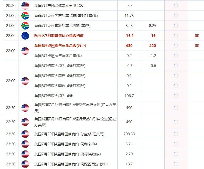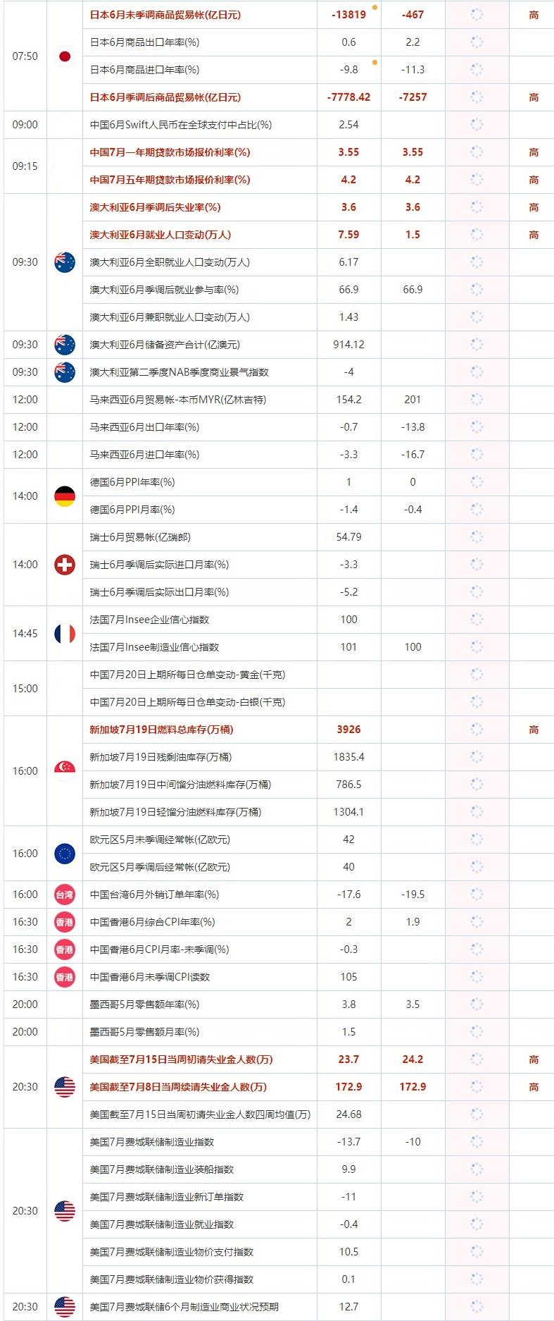 ——7月20日,投资者需要关注的重点数据:日本6月未季调商品贸易帐,日本6月季调后商品贸易帐,澳大利亚6月季调后失业率,澳大利亚6月就业人口变动,美国截至7月15日当周初请失业金人数,美国截至7月8日当周续请失业金人数,美国6月成屋销售年化总数和欧元区7月消费者信心指数初值。当天需要关注的大事:欧洲央行管委兼法国央行行长维勒鲁瓦发表讲话。