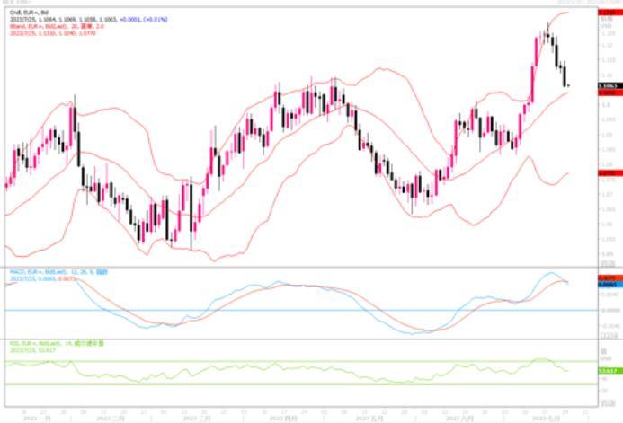 周一(7月24日)欧元兑美元下跌0.49%,报1.1069。近期出炉的经济数据显示美国经济表现强于预期,而欧元区经济放缓。一项备受关注的采购经理人调查显示,7月美国企业活动放缓至五个月低点,受服务业增长放缓拖累,但该数据好于欧洲的同类调查。美联储将于周三结束政策会议,之后欧洲央行和日本央行将分别在周四和周五宣布利率决定。投资者预计欧洲央行和美联储都将加息25个基点,市场对两家央行会议的焦点都集中在他们围绕9月会议发出的信号上。通胀指标不断回落可能会给美联储提供暗示将暂停加息的空间。但由于目前美国的经济状况好于其他地区,因此美元似乎也从中受到支撑而难以回弱。除非欧洲央行继7月之后还有继续加息的打算,或可提振欧元转强。日线图上欧元/美元不断回落逼近布林带通道中轨线,且已回到此前的强阻力线1.1060附近,若继续跌穿该水平,下方将一次考验1.10、1.0970乃至1.0900这些水平的支撑。目前技术指标均显示欧元处在下行之中。