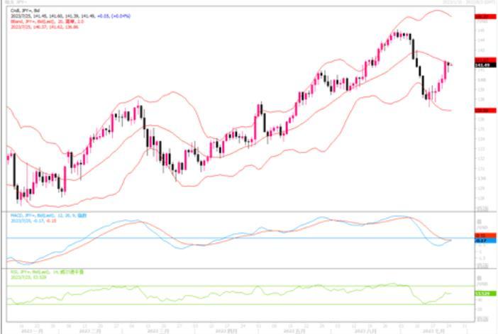 周一(7月24日)美元兑日元下跌0.22%,收盘于141.48。本周日本央行也将召开利率会议。尽管日本央行的官员们似乎仍保持着维持宽松的态度。但交易员们似乎觉得在这三大央行中,日本央行最有可能宣布引发市场波动的意外决定,交易员称,市场认为日本央行将有可能调整其收益率曲线控制(YCC)政策。如果日本央行最终果然有所行动的话,无疑将会引起日元的剧烈波动。因此,汇市上日元的交易似乎有提前为此做准备的动向。日线图上,美元/日元此轮反弹目前遇阻于布林带通道中轨线。4小时图上,MACD信号线出现粘连,RSI也从超买区域有所回落,美元继续冲高力度开始减弱。在欧美日三大央行会议出炉结果之前,料美元/日元的交投将变得谨慎。