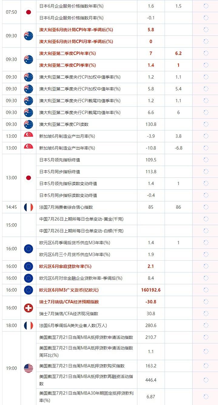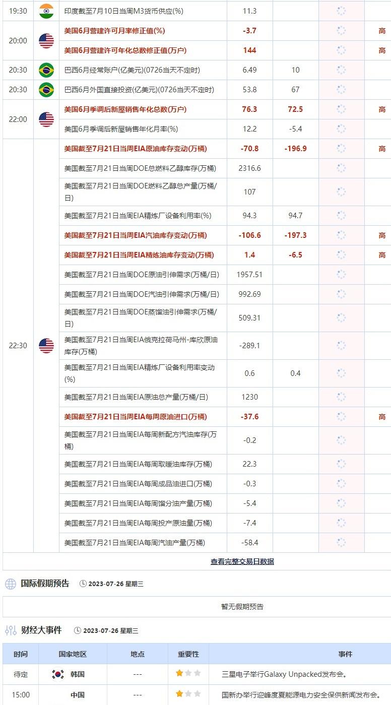 ——7月26日,投资者需要关注的重点数据:澳大利亚6月CPI,欧元区6月家庭贷款年率,欧元区6月M3广义货币,美国6月营建许可月率修正值,美国6月季调后新屋销售年化总数和美国截至7月21日当周EIA原油库存变动。
