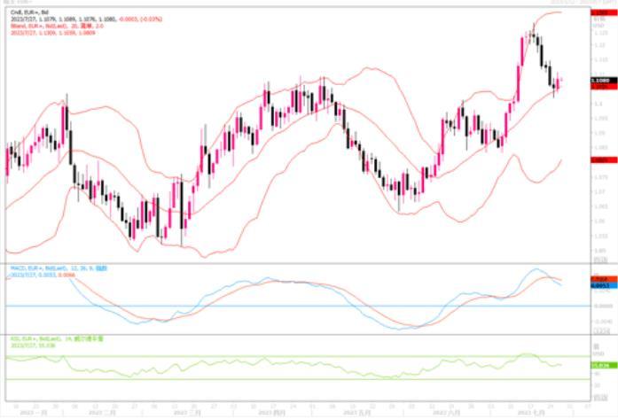 周四(7月27日)欧元兑美元下跌1.06%,至1.0965美元。周四,欧央行宣布在此加息25个基点,使其主要利率达到3.75%。会后,欧央行在声明中表示:管理委员会将继续遵循依赖数据的方式,以确定适当的限制水平和持续时间。这样的一个回答其实和隔夜美联储主席鲍威尔的措辞如出一辙,显得模糊偏中性。当前越来越多投资人士对欧央行在夏季后的做法抱有预期,暨通货膨胀有所缓解,但货币政策是否正在将该地区推入经济衰退的问题依然存在。欧央行的一项调查显示,6月中旬至7月初,欧元区企业贷款降至历史最低水平。本周稍早公布的欧元区企业活动数据显示,欧元区最大经济体德国和法国经济下滑。都显示欧元区今年经济将陷入衰退的风险在逐渐上升。相反,美国第二季度经济增长速度超过预期,原因是劳动力市场的韧性支撑了消费者支出,同时企业增加了设备投资,经济衰退有可能得以避免。同样是加息,给出的效果似乎看出美国更具备软着陆的实力。日线图上,欧元/美元大踏步远离布林带中轨之下,技术指标明显偏向下行。如果下方1.09失守,去年9月份以来所形成的上升通道将会遭到破坏。