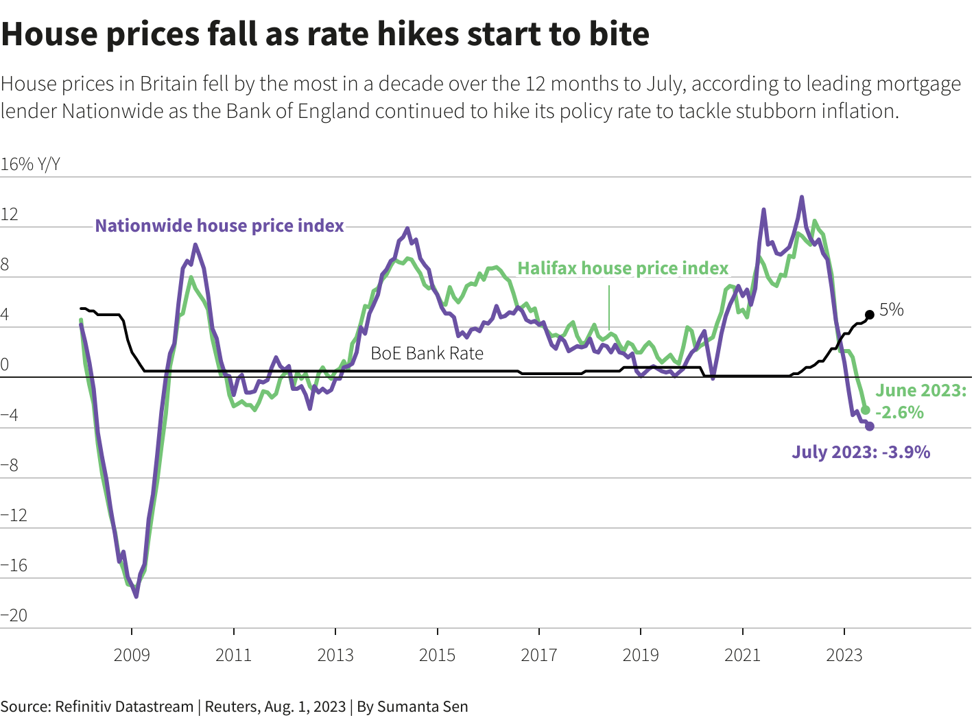 抵押贷款机构Nationwide和Halifax测算的房价同比跌幅创逾10年最大,因预期借贷成本将进一步提高,抵押贷款利率迅速上升。