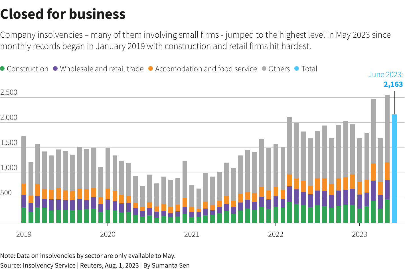 2023年第二季度,英格兰和威尔士的企业破产数量达到2009年以来的最高水平。