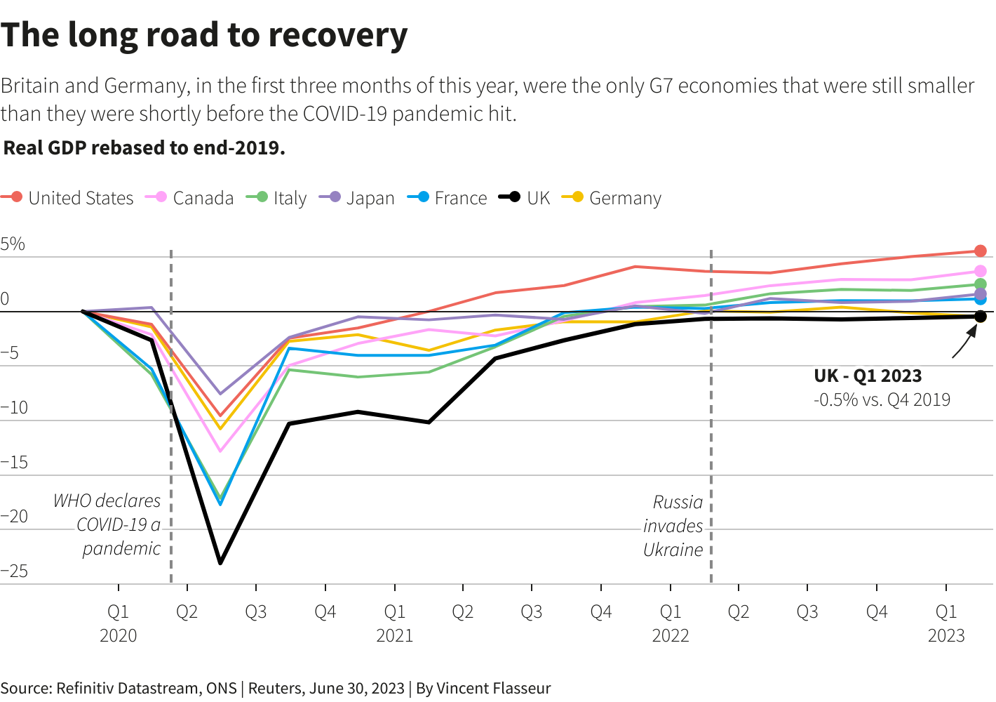 截至2023年第一季度末的数据显示,英国GDP从疫情中复苏的速度,比除德国以外的所有其他七国集团(G7)经济体都要慢。