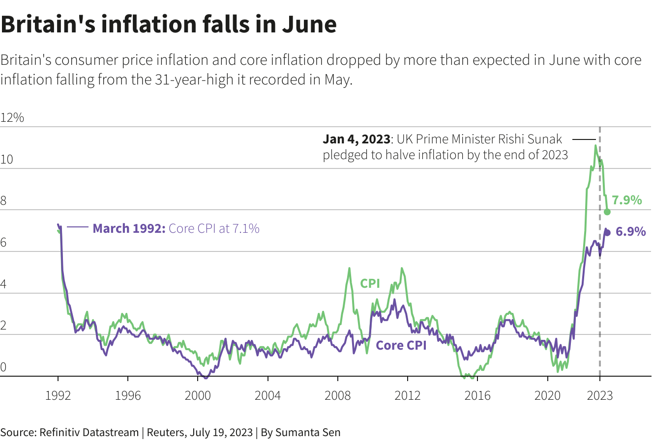 英国6月份消费者物价通胀率降幅超过预期,从5月份的8.7%大幅降至7.9%。但仍然是七国集团(G7)经济体中最高的。