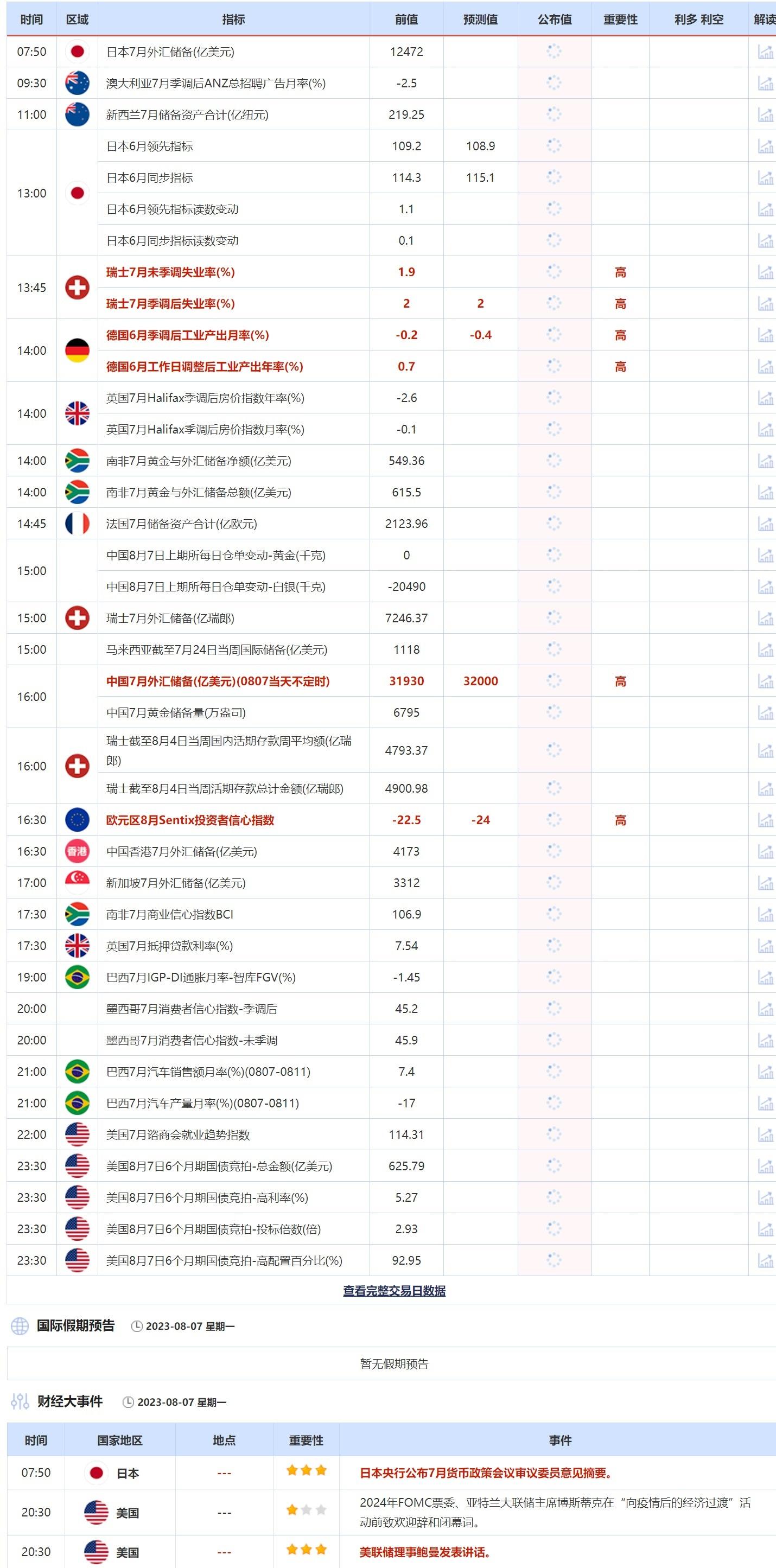 ——8月7日,投资者需要关注的重点数据:德国6月季调后工业产出月率,德国6月工作日调整后工业产出年率,中国7月外汇储备,欧元区8月Sentix投资者信心指数。日本央行公布7月货币政策会议审议委员意见摘要,美联储理事鲍曼发表讲话。