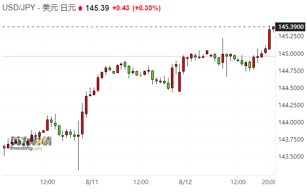 周一(8月14日)欧洲时段,日元汇率再次走弱,最低达到1美元兑145.41日元,创去年11月以来的最低水平。