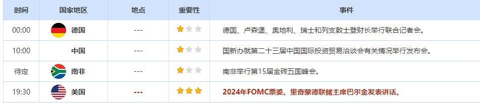 8月22日,投资者需要关注的重点数据:英国8月CBI工业订单差值,英国8月CBI工业出口订单差值,英国8月CBI工业物价预期差值,英国8月CBI工业产出预期差值,美国7月成屋销售年化总数。需要关注的大事件包括里奇蒙德联储主席巴尔金发表讲话,南非举行第15届金砖五国峰会。