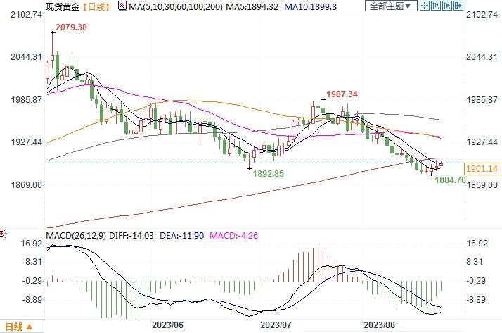 现货黄金日线图北京时间8月23日10:27,现货黄金报1901.02美元/盎司
