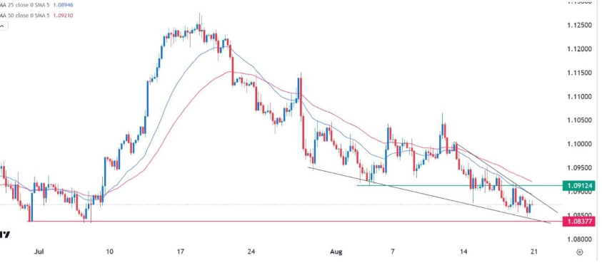 欧元兑美元货币对的技术分析过去几个月,欧元兑美元货币对一直处于强劲的看跌趋势。近期重要支撑位1.0912已转为阻力位。这是一个重要点,因为这是 8 月 3 日的低点。该货币对仍低于 25 日和 50 日移动均线。