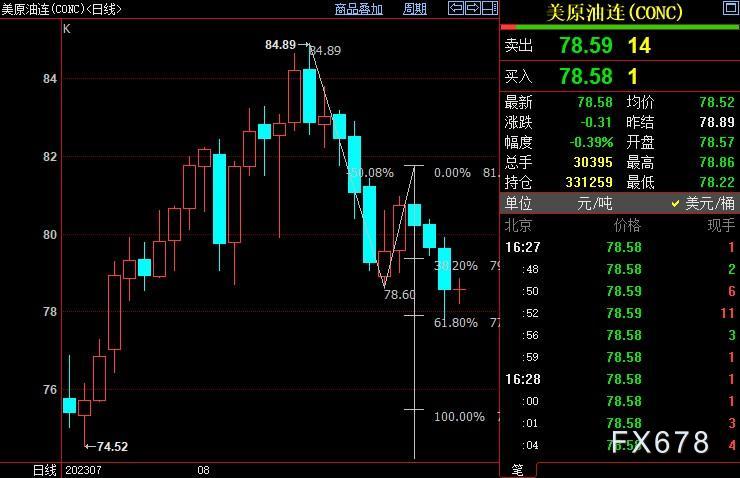 北京时间16:29,NYMEX原油期货下跌0.43%至78.55美元/桶;ICE布伦特原油期货下跌0.34%至82.54美元/桶。