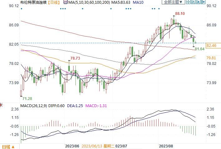 布伦特原油连续日线图北京时间8月24日15:30 布伦特原油连续 报 82.46 美元/桶