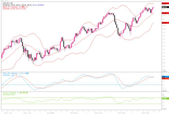 上周五(8月25日),美元兑日元上涨0.42% 至146.45。在周五的世界央行行长研讨会上,美联储主席鲍威尔对于是够继续加息虽然表示态要“谨慎行事”,但也明确表态美联储可能需要进一步加息以确保通胀得到遏制。其发表讲话后,利率期货市场对于年内11、12月份继续加息的预期概率进一步提升。一直一来饱受利差困扰的日元继续在汇市上遭到抛售。预料在利差这个主要影响因素的推动下,美元/日元将存在继续攀高的趋向。日线图上,美元/日元继续沿短期均线上行,美元攀高趋向暂时维持未有改变。但似乎有顶背离迹象,还是要时刻注意日本央行干预所带来的调整性回落风险。