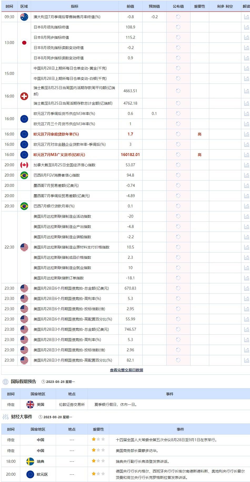 8月28日,投资者需要关注的重点数据:澳大利亚7月季调后零售销售月率终值,欧元区7月家庭贷款年率,欧元区7月M3广义货币,美国8月达拉斯联储制造业活动指数。需要关注的大事件包括德国央行行长内格尔、西班牙央行行长埃尔南德斯德科斯、奥地利央行行长霍尔茨曼和荷兰央行行长克罗格斯拉普发表讲话。