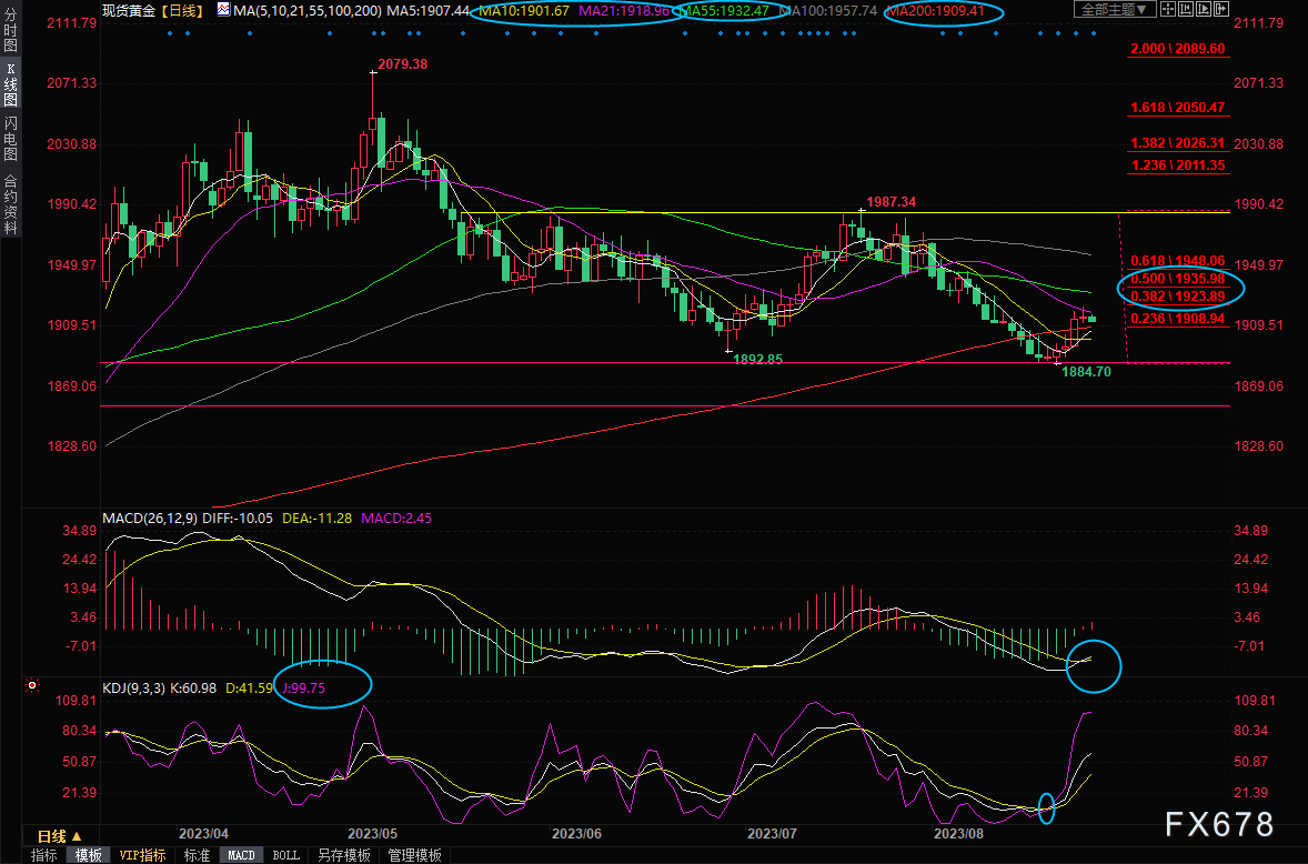 不过,隔夜金价受到38.2%回撤位阻力压制后,收盘于21日均线下方,且录得十字星,暗示该位置阻力较强,若金价回落至10日均线下方,也可以参考1900关口,则增加金价重回跌势或者是W底的可能性;另外,200日均线1909.41附近也存在一些支撑。