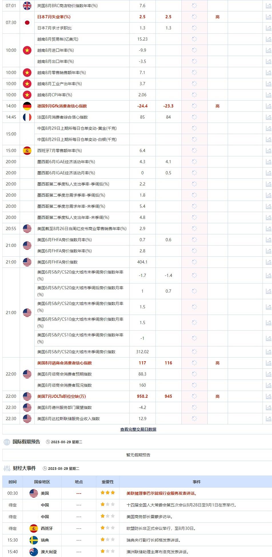 8月29日,投资者需要关注的重点数据:日本7月失业率,德国9月Gfk消费者信心指数,美国8月谘商会消费者信心指数,美国7月JOLTs职位空缺。需要关注的大事件包括澳洲联储助理主席布洛克发表讲话,瑞典央行副行长邦格发表讲话。