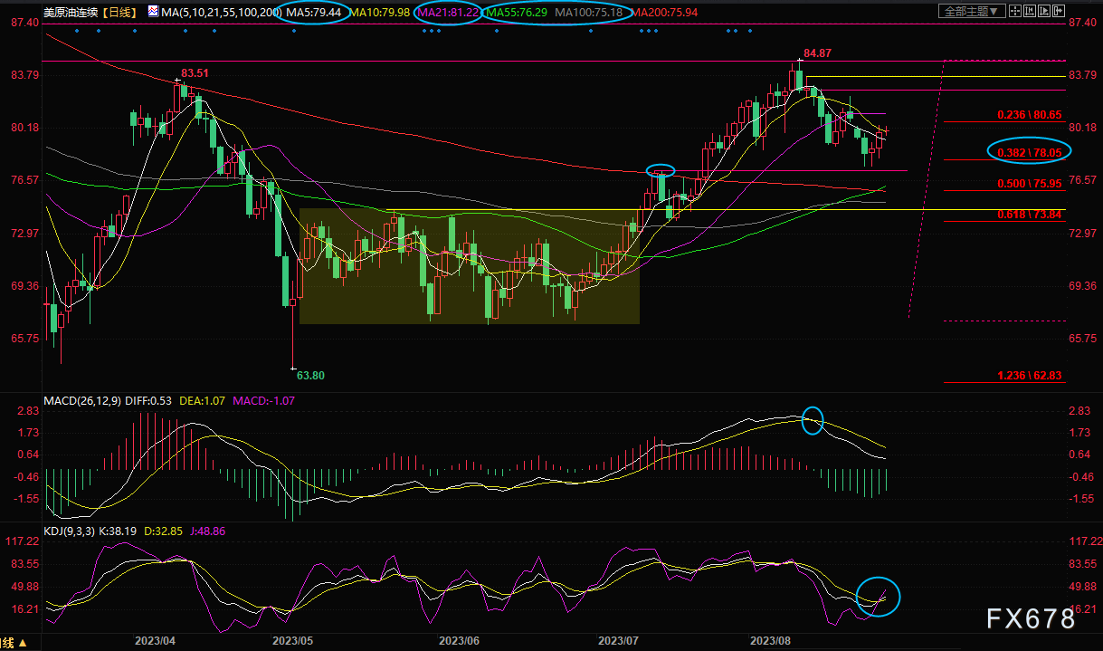日线级别:高位震荡;油价的高位回调守住了38.2%回撤位78.05附近关键位置,KDJ重新结成金叉,短线下行风险有所减弱,连续三根K线均带下影线,而且低点逐步上移,暗示下方支撑较强,后市重拾涨势的可能性有所增加;上方初步阻力在21日均线81.22附近,若能顶破该阻力,则油价后市可能会重新上探近期高点84.87附近阻力。