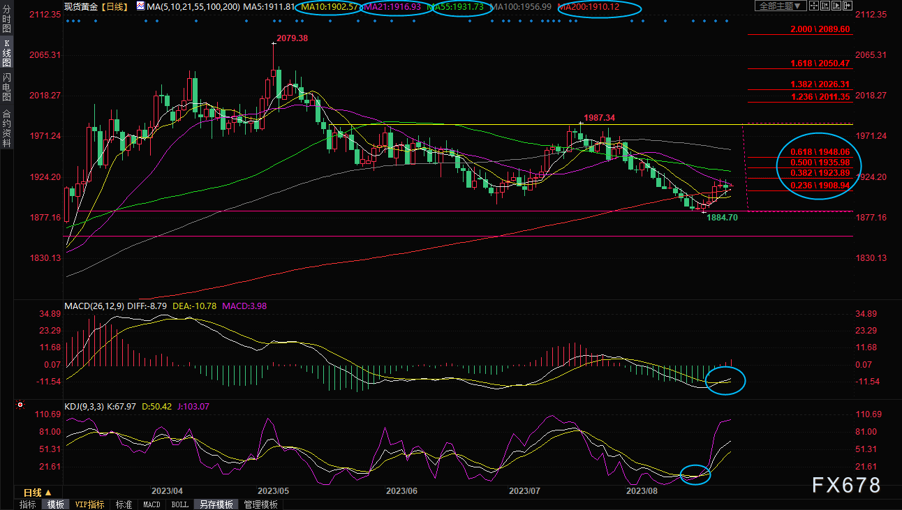 需要提醒的是,上周五美联储主席鲍威尔讲话后,市场对美联储年内再加息一次的预期有所升温,仍需提防金价重回跌势的可能性。日线级别:震荡下跌后反弹;金价在强支撑位附近获得支撑后反弹,并顶破200日均线阻力,MACD金叉,KDJ金叉,在失守200日均线1910.13前,短线仍偏向延续反弹走势,初步阻力继续参考1987-1885跌势的38.2%回撤位1923.89附近,然后是55日均线1931.74附近位置,若能顶破该阻力,则增加短线看涨信号;进一步阻力参考1940关口和61.8%回撤位1948.06附近位置。
