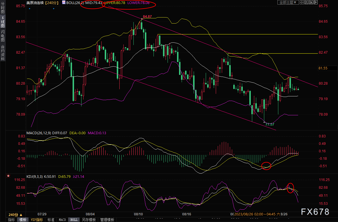 4小时级别:震荡;MACD金叉,KDJ死叉,短线走势变动较大,布林线轨道水平运行,留意布林线轨道78.08-80.78区域突破情况;由于84.87以来下行趋势线和布林线上轨的压制,油价在布林线上轨附近录得了局部“吞没”看空K线组合,短线油价略微偏向震荡下行,布林线中轨支撑目前在79.43附近,布林线下轨支撑在78.08附近,若失守该支撑,则增加后市看空信号。