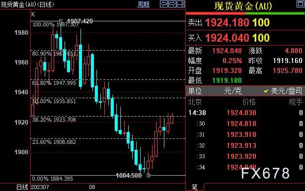 日线图上看,金价正尝试突破1924美元,站上之后有望进一步升向1936美元,它们分别是1987美元-1884美元下行区间的38.2%斐波那契回档位和50%斐波那契回档位。