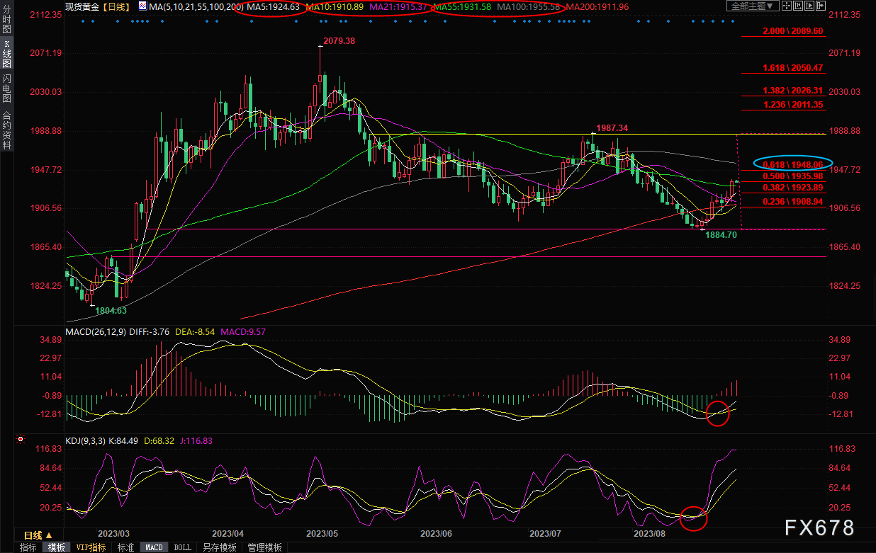 另外,本交易日还将出炉美国二季度GDP修正值和二季度PCE修正值,投资者也需要予以留意。日线级别:震荡下跌后反弹;形态上有点V型反转的迹象,MACD金叉,KDJ金叉,5日均线连续上穿10日均线、200日均线和21日均线,金价也顶破了21日内均线和55日均线,在失守55日均线1931.57前,短线偏向多头,金价有望进一步试探100日均线1955.57附近阻力,进一步阻力参考布林线上轨1969.85附近位置;短线的话,1940关口和前期跌势的61.8%回撤位1948.06附近也分别存在一些阻力。