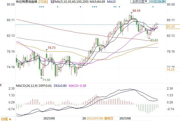 布伦特原油连续日线图北京时间8月31日16:42,布伦特原油连续报85.40美元/桶