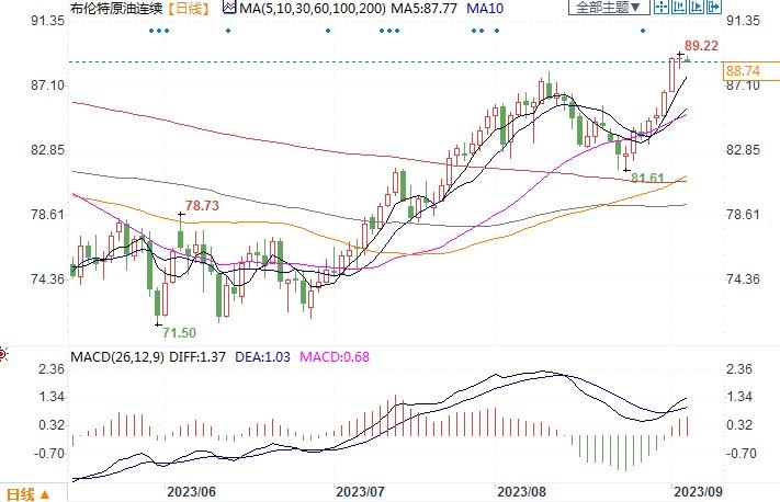 布伦特原油连续日线图北京时间9月5日11:07 布伦特原油主力合约现报 88.92 美元/桶