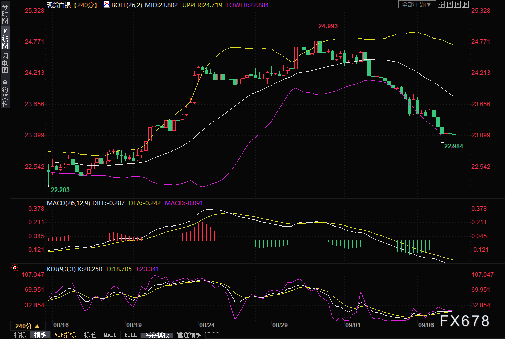 现货白银4小时图北京时间9月7日10:51 现货白银 报 23.11 美元/盎司