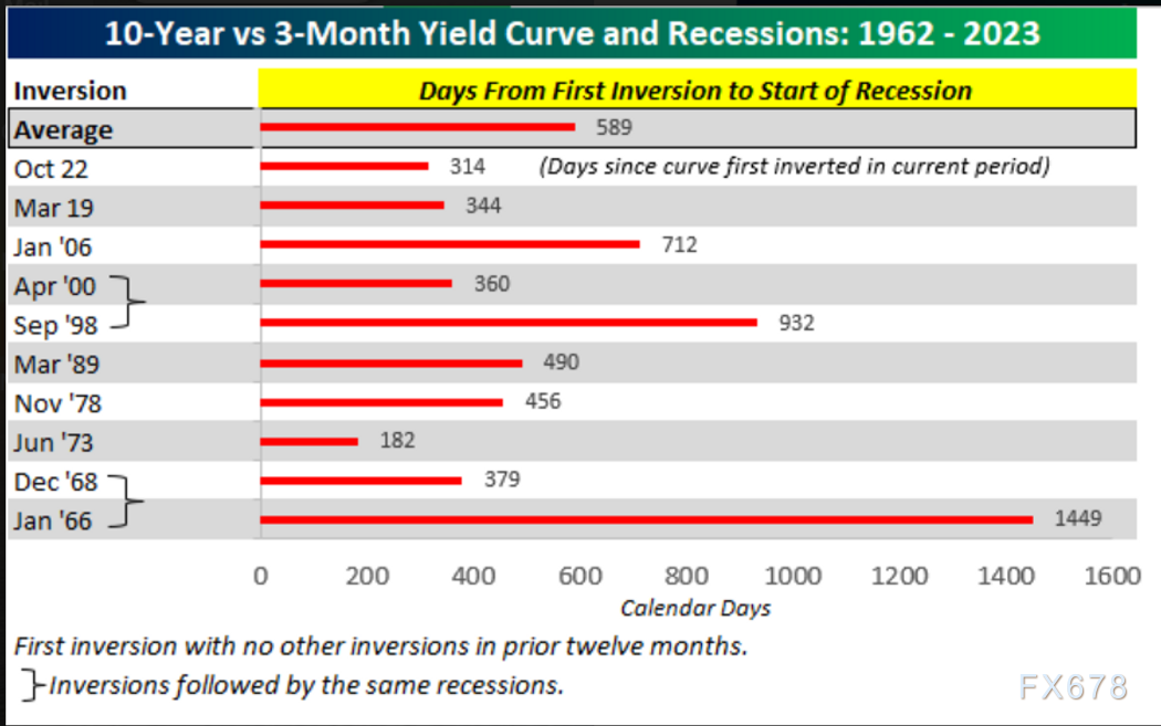 这一判断基于自20世纪60年代初以来的数据,显示在10年期和3个月期国债收益曲线首次倒挂后,过去的衰退平均需要589天才会出现。